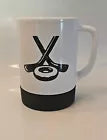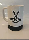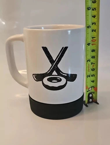 "Celebrate your love for Tim Hortons and hockey with this unique coffee mug featuring a hockey puck bottom, two hockey sticks, and the iconic Tim Hortons donut design. Made in Canada in 2018, this white mug is a must-have collectible for any coffee or tea lover. Show off your Canadian pride with this original Tim Hortons advertising piece."